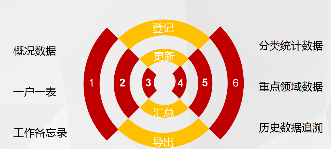 建立覆盖域内所有乡村的基层工作电子台帐管理系统,提供一个方便、有效、快捷的工作数据平台。将党建、维稳、宗教管理、“一户一表”、出国人员、重点要害单位、四知四清四掌握、“访惠聚”活动、党群议事、人口计生、集体经济、工作备忘录、大事记等各方面工作数据纳入统一管理,实现信息多级共享,动态化管理,过往数据可追溯,减少年年重复登记,使村干部从繁锁的“填表”工作中解脱出来,全身心投入到为民服务中来。